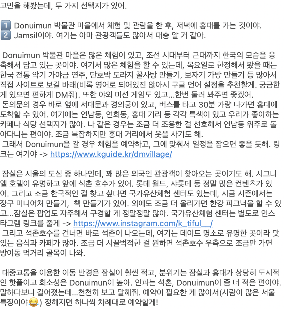 최근에 한동안 친구들에게 했던 밸런스 게임이 있다. 모든 결정을 일방적으로 하고 통보하는 애인과 사소한 것 하나하나까지 다 물어보고 결정하는 애인. 그리고 지금 나는 후자가 된 거 같다. 이 뭐라해야하지...흔하게 가는 관광지는 아니되 한국적인 멋과 편리함과 등등을 다 고려하다보니 계속 질문만 날리고 있다. 그래서 쿨하고 소통 잘하는 거 어떻게 하는데...오늘 루트 정하라는 말만 1260자로 했는데...